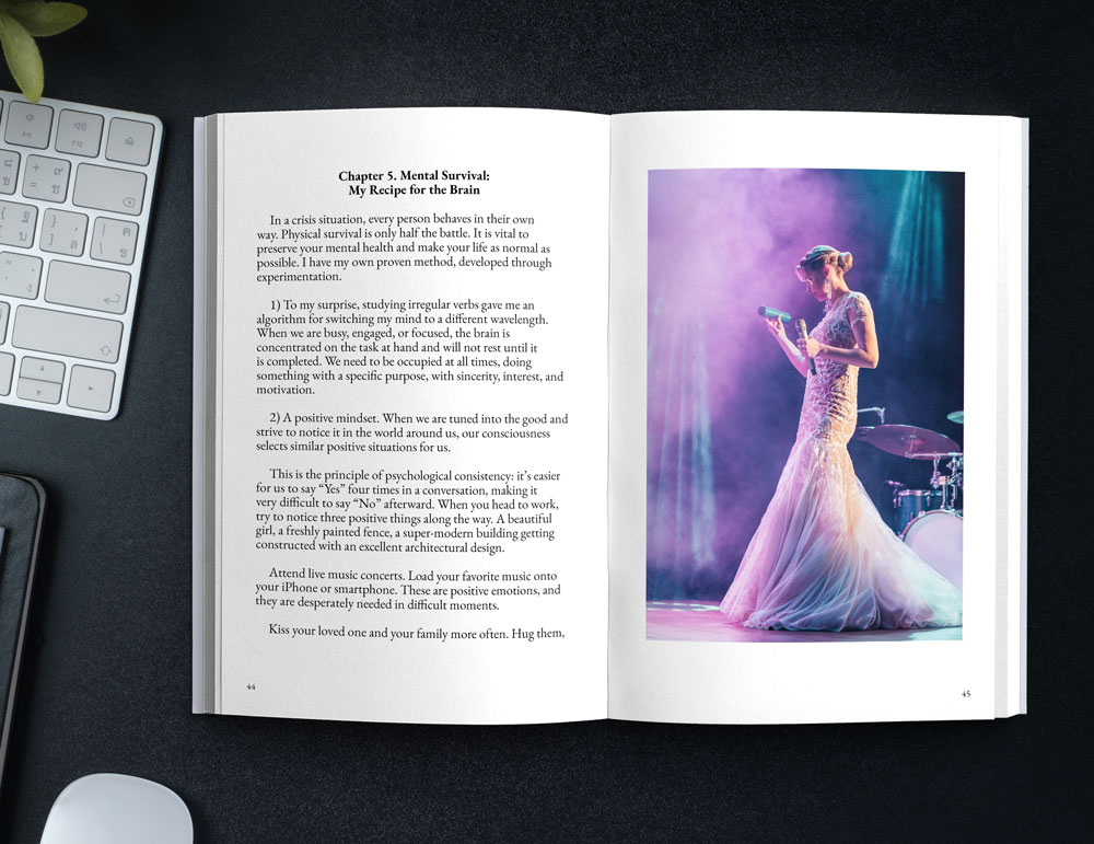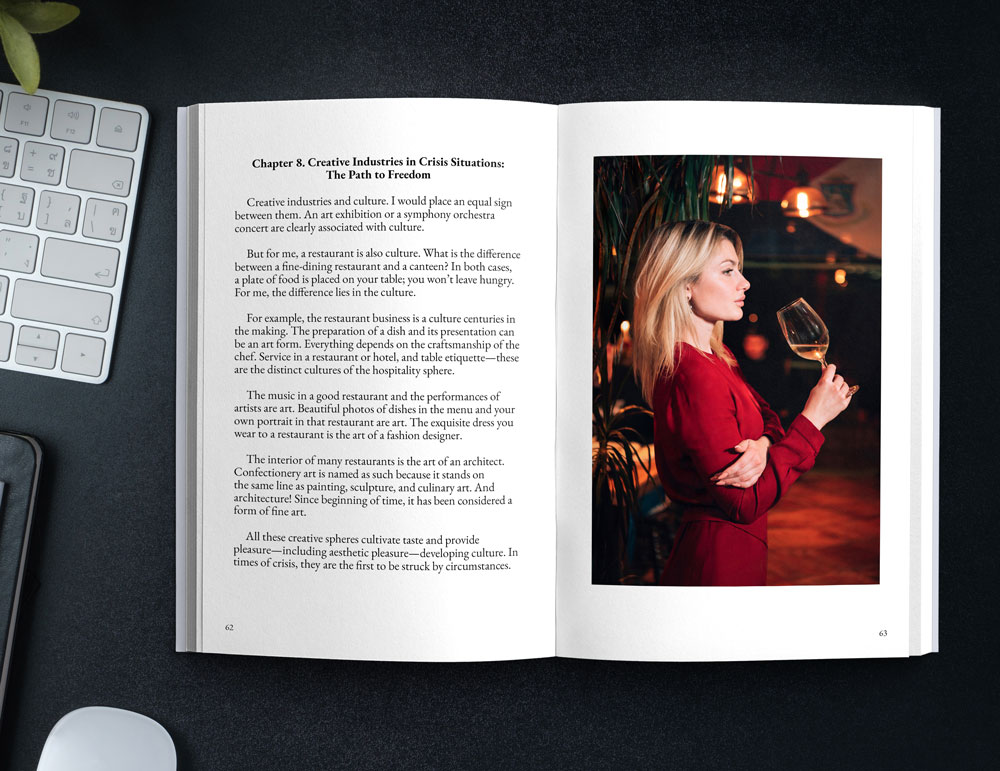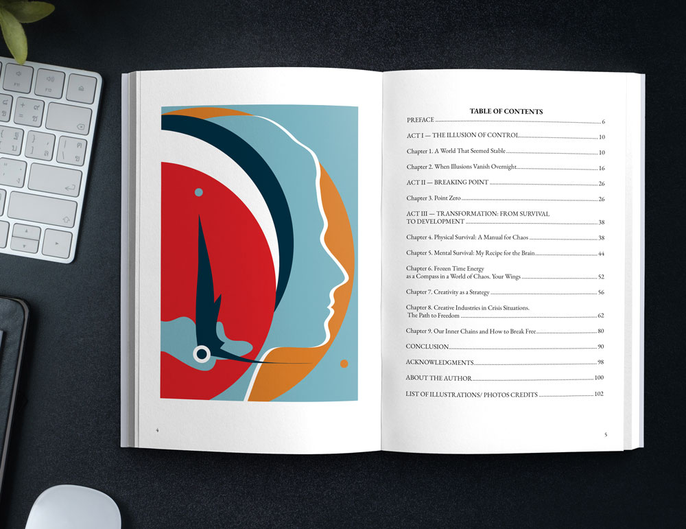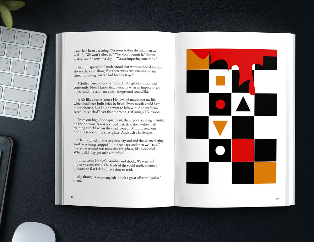 The book is compact in content. I intentionally did not develop it to the size of a novel. Although I certainly have much more to tell you. I wanted this book to be read quickly but absorbed deeply. It was not enough for me to put my thoughts and feelings into words. Specifically for this book, I developed exclusive graphic works—digital art. They will help to understand the context more deeply. Also, the book is supplemented with the author’s photographs. Many of these projects were created by me, my partners, clients, and like-minded people in Ukraine during the war. Looking at these photos, you will not believe in what conditions and under what pressure of circumstances they were created. And you will see what results we have achieved.